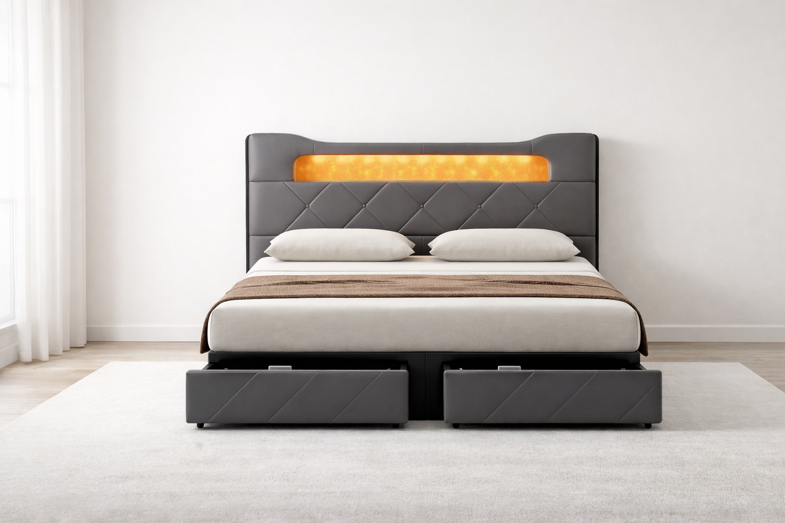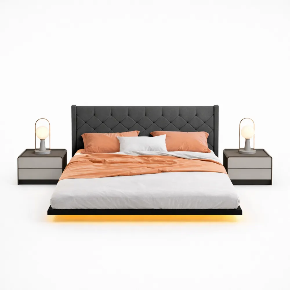 Ce lit au design flottant est conçu avec des pieds dissimulés, offrant une sensation de légèreté visuelle.